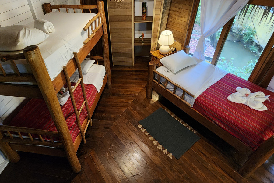 Nivel: 2 | Clasificación: cuarto cuádruple | 1 cama king (2.00 x 2.00 mts) + 1 litera con 2 camas individuales (1.00 x 1.90 mts) | Ocupación máxima: 4 personas. Baño privado | Aire acondicionado | Wifi gratis. Vista: riachuelo, jardín